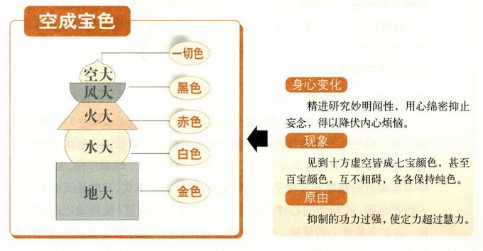 又以此心。精研妙明。观察不停。抑按降伏。制止超越。于时忽然。十方虚空。成七宝色。或百宝色。同时遍满。不相留碍。青黄赤白。各各纯现。此名抑按。功力逾分。暂得如是。非为圣证。不作圣心。名善境界。若作圣解。即受群邪。