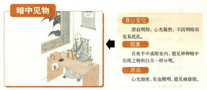 又以此心:以这个定的心,研究澄彻:研究清彻。精光不乱:这种澄彻的精光不乱,有一种定力。忽于夜半:忽然间在夜半,在暗室内:在那么一个没有光的房子里边,见种种物,不殊白昼,而暗室物,亦不除灭:看见种种的东西,不但房子里的东西看得见,而且房子外边的东西,也看得见。不但房子外边的东西,可以看得见;这个房子里边本来有的东西,也可以看得见。不但本来有的东西,可以看得见,而且从这个房子外边所来的东西,也看得清清楚楚。