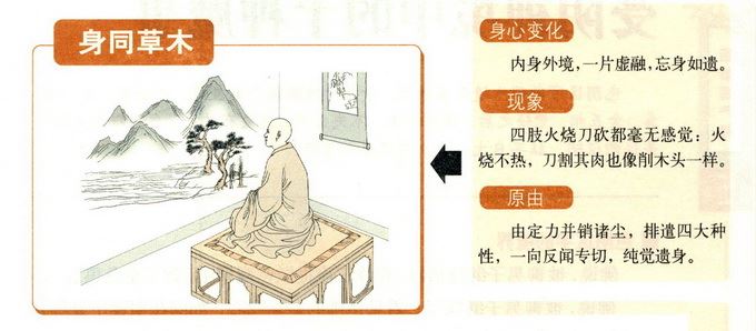 又以此心。圆入虚融。四肢忽然。同于草木。火烧刀斫。曾无所觉。又则火光。不能烧爇。纵割其肉。犹如削木。此名尘并。排四大性。一向入纯。暂得如是。非为圣证。不作圣心。名善境界。若作圣解。即受群邪。