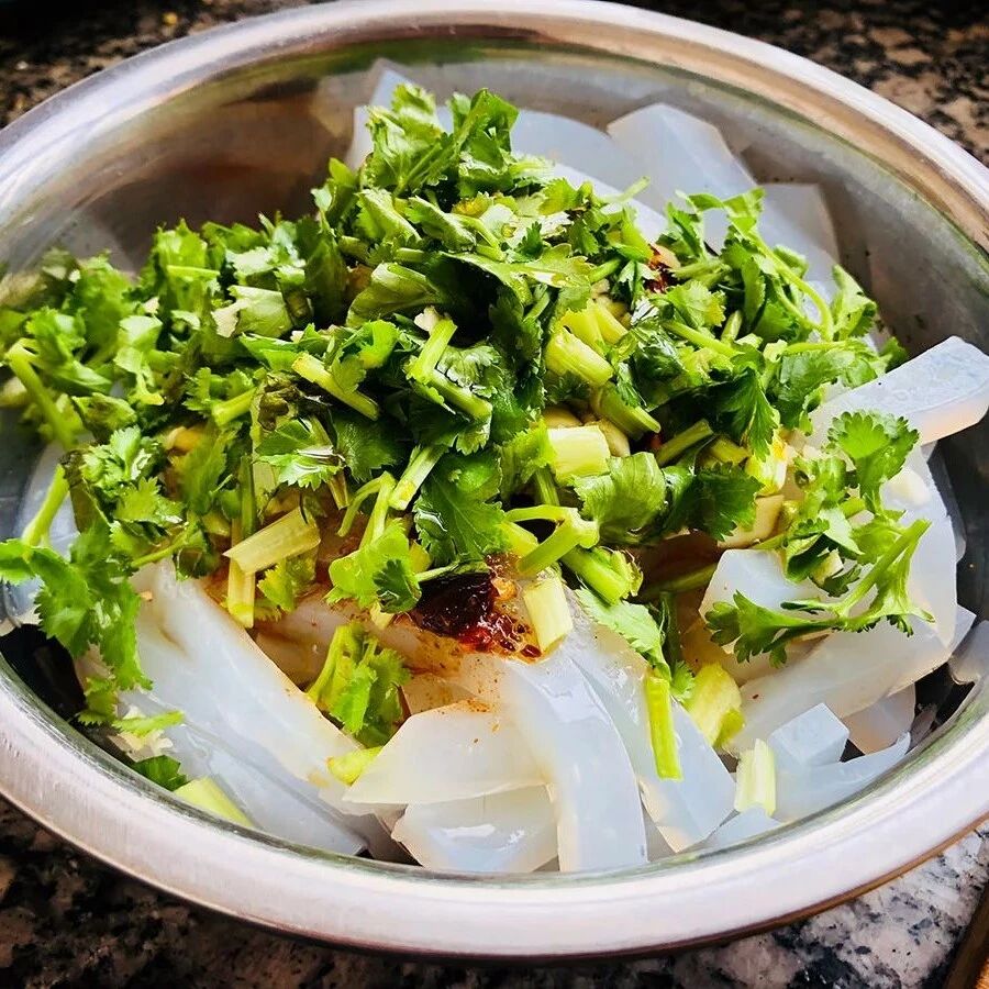 7. 凉粉切段,放入盐、醋、生抽、蔬果粉、辣椒油。