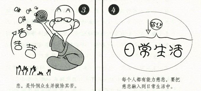 悲 ,是怜悯众生并拔除其苦。 每个人都有能力慈悲,要把慈悲融入到日常生活中。