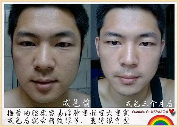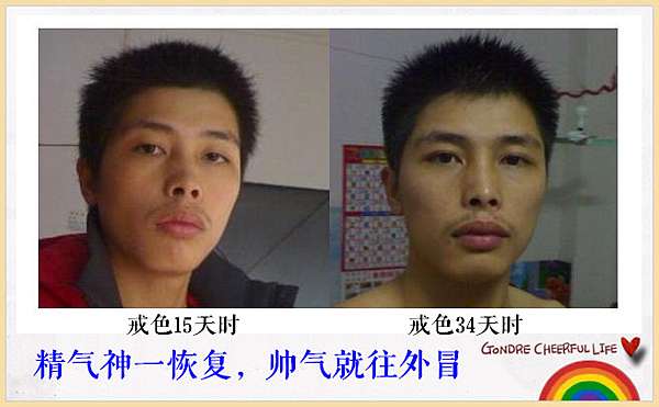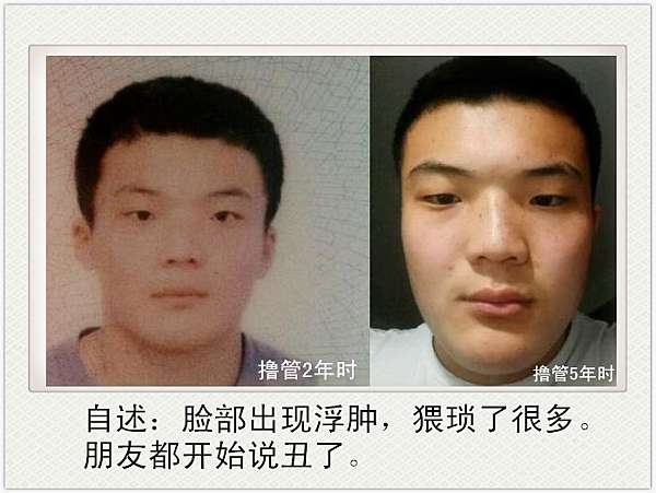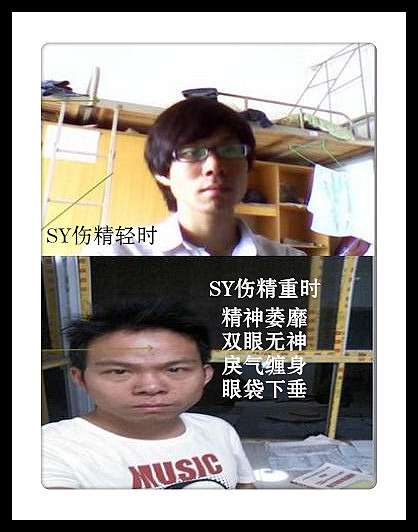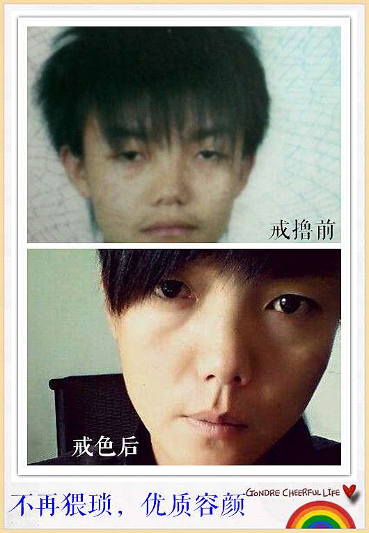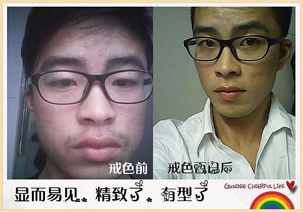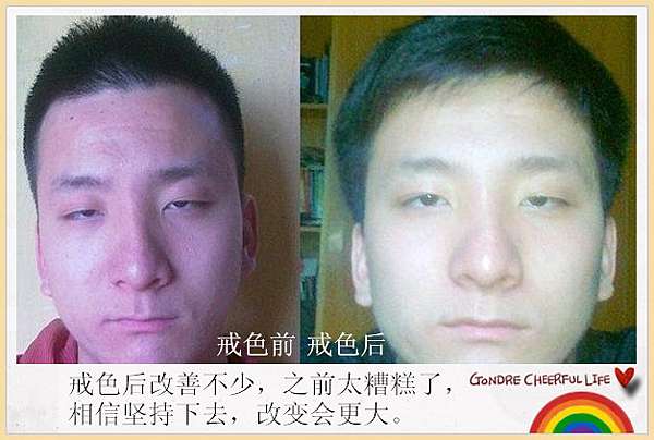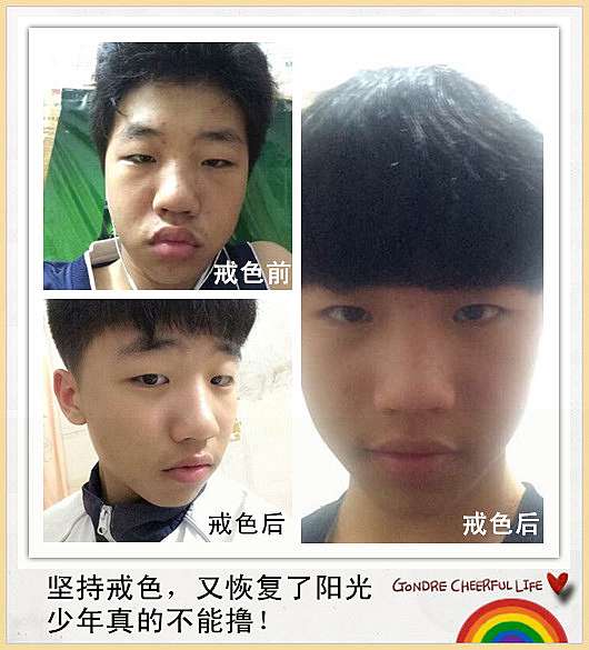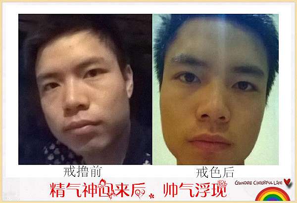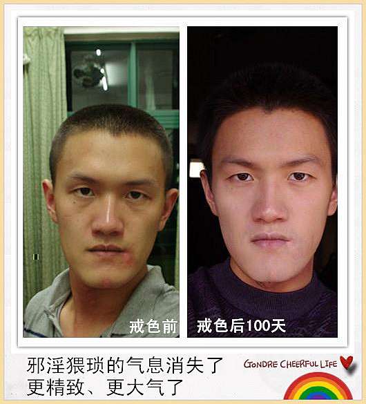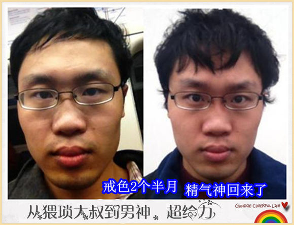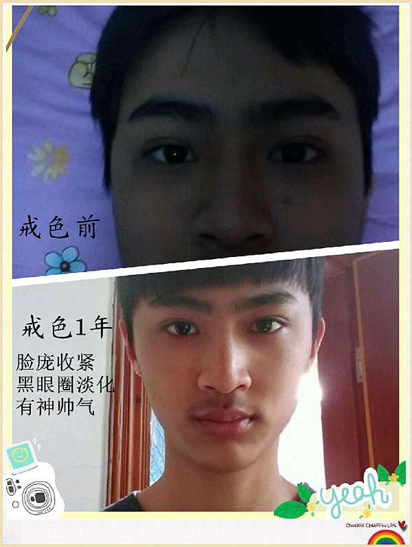 4.臉型:傷精到一定程度,臉龐容易變形,以浮腫、變寬變大和松弛下垂等表現為主,凹陷也多見。戒色後臉龐會重新收緊,五官會變得精致有型。