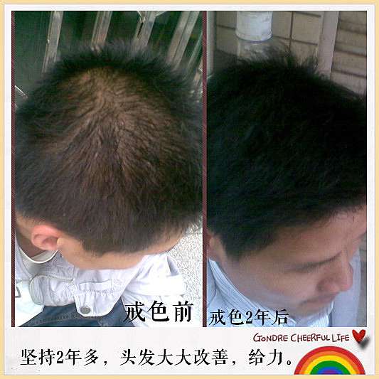 5.頭髮:傷精患者出現白髮、脫髮、髮質枯黃等問題的比較多,中醫講到髮為腎之華,堅持戒色,養足腎氣,頭髮自然就會改善。