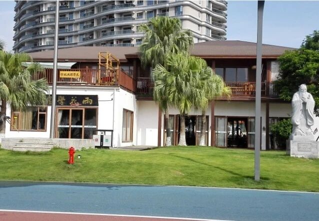 滨海雨花风景好,堂前先贤抚手笑。晚风轻拂滨海湾,还有椰林缀斜阳。