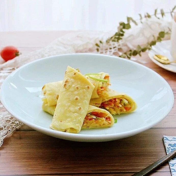 6、舀一些饭平铺在寿司帘上,放上生菜、炒好的小菜,卷起就好啦
