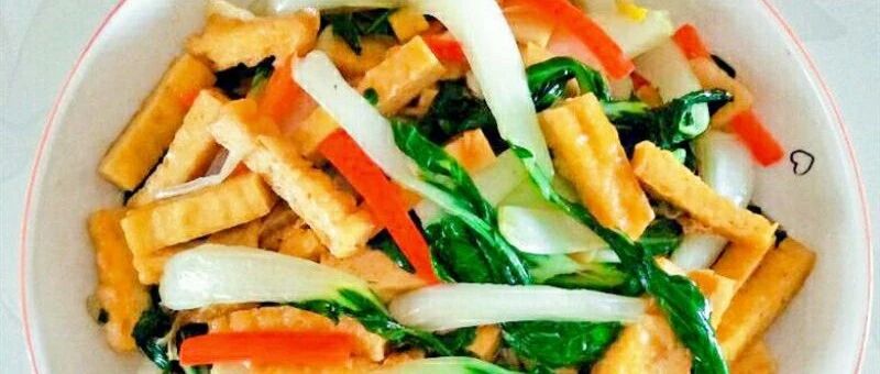 原料:奶白菜200克、豆腐干4片、甜椒半个、姜1块