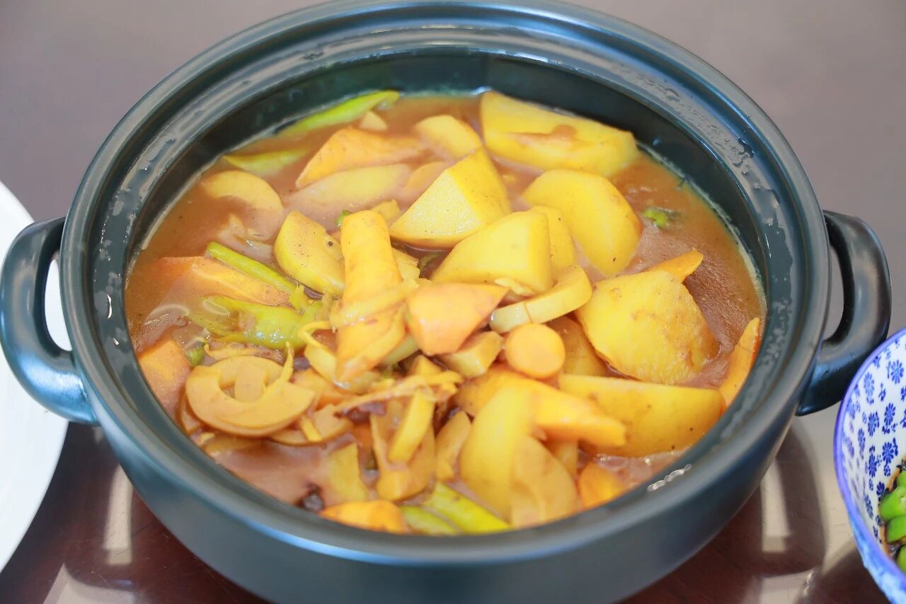 1. 锅中加酵素养油,放入蒜粒、柠檬树叶、生姜丝爆香,加入咖喱膏炒匀后,加入酸笋、青辣椒煸炒;