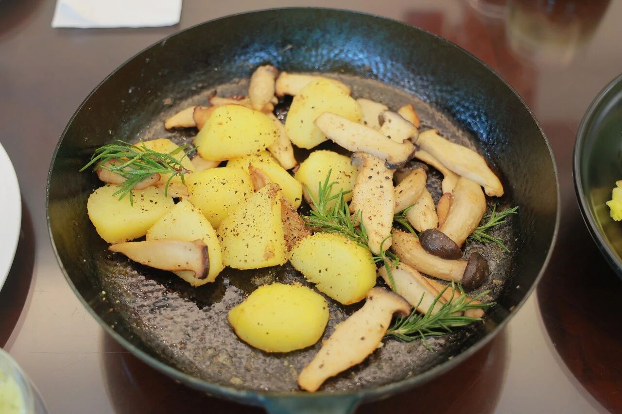 2. 锅中加酵素养油,放入切成片的杏鲍菇和土豆块煎至焦黄,加入迷迭香;
