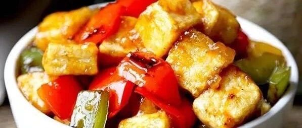 豆腐一块、糖一勺、醋一勺、红色和绿色甜椒各一个、马铃薯淀粉半碗、盐一勺、酱油半勺。