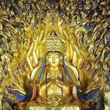 河北正定隆兴寺大悲阁观音菩萨铜像,高21.3米,拥有42只手。其中,两手在胸前合十,左、右两侧各有20只手侧举。在侧举的40只手中,分别拿着日、月、净瓶、金刚杵、乾坤带等法器,象征着观音菩萨拥有极大的法力,可以为广大众生解除各种各样的苦难。(图片来源:凤凰佛教)