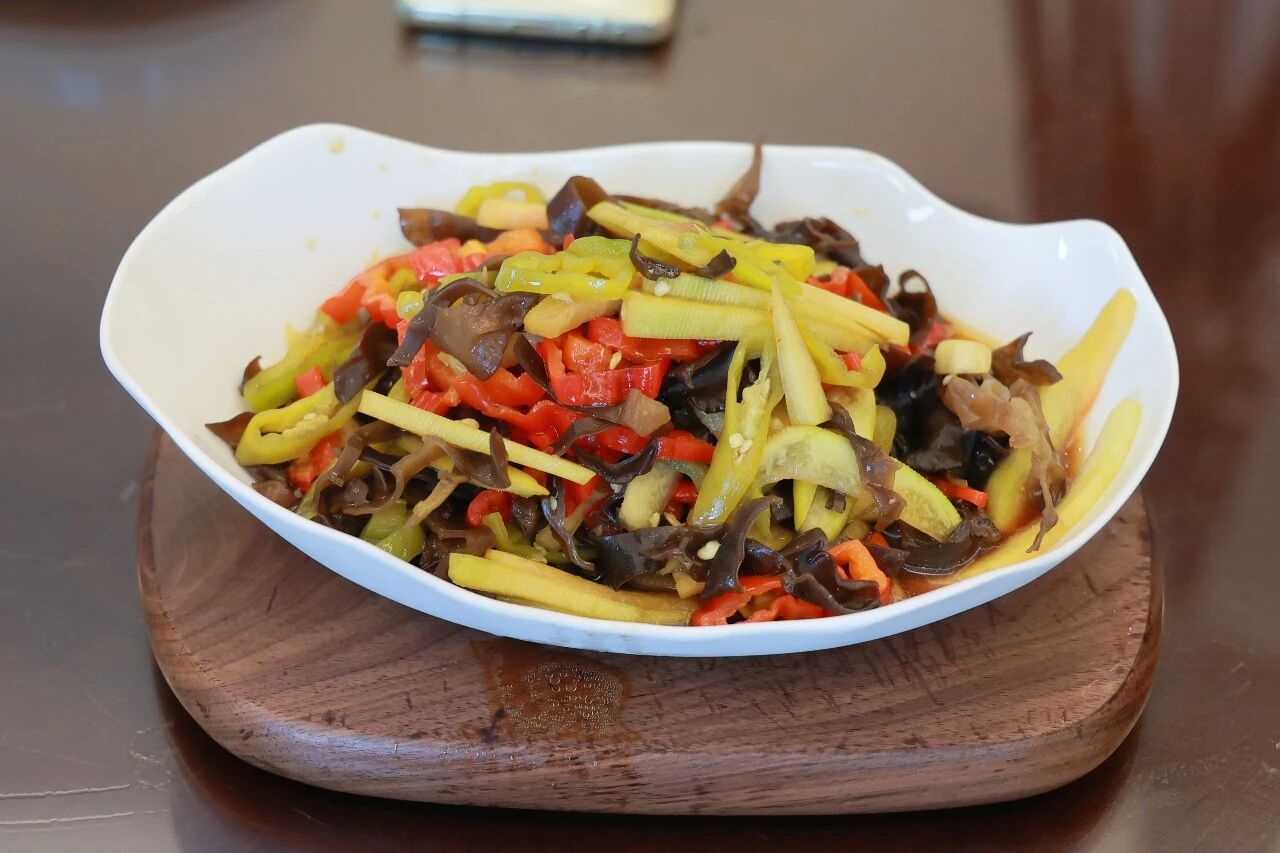 1. 酵素泡菜西瓜皮切条,泡辣椒切丝,黑木耳泡发后择洗干净焯水过凉;