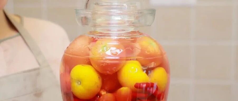 1. 番茄和小米辣洗干净控干水分,放入泡菜坛中;