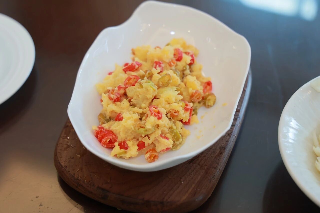 1. 酵素泡菜青椒切成粒,土豆蒸熟后碾成土豆泥,将泡菜青椒放进去,倒上芥末酱,拌匀。