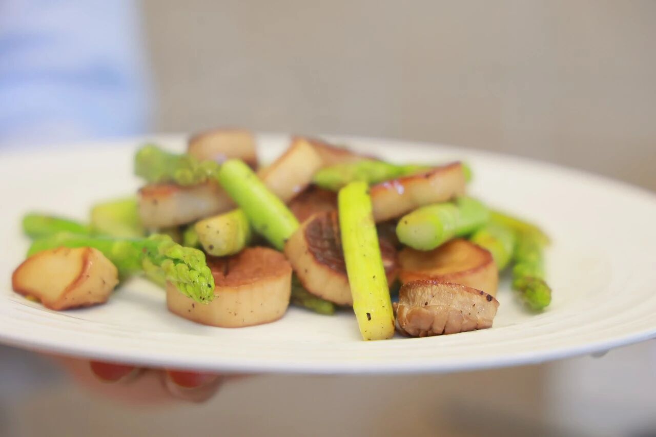 2. 加入芦笋煎炒,最后加2瓶盖酵素饱和盐,撒入胡椒粉拌炒均匀就可以了。