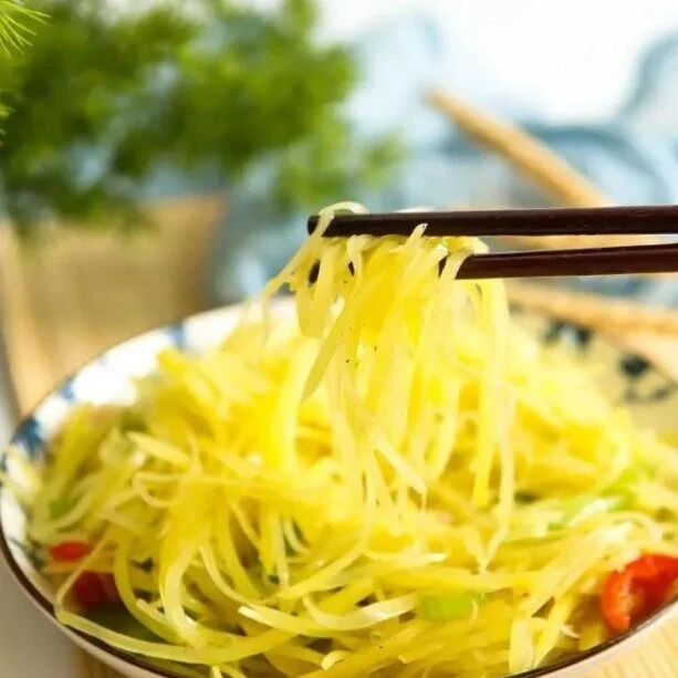 所以,把土豆切成丝之后,一定要把土豆丝放在盆里泡一会,将土豆丝里的淀粉泡出来。这样就可以避免土豆丝粘连并且黏糊糊的不好吃,吃起来脆爽。
