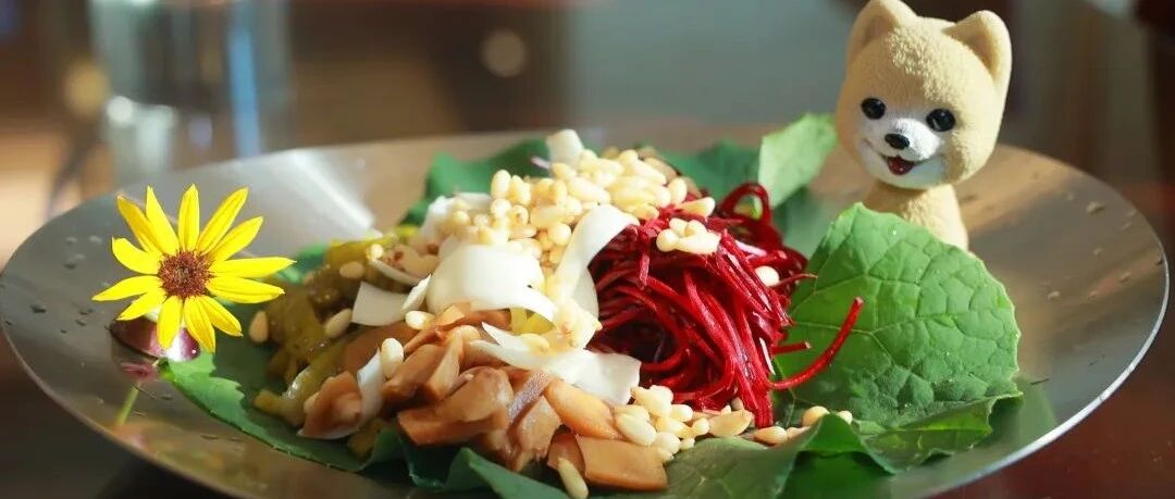 2. 夏天正是生长的季节,到处都是漂亮的叶子,摘了一片丝瓜叶子铺在盘子上,先把甜菜根丝放在盘中,再把青椒和姜放在旁边,用2瓶盖酵素饱和盐,30ml酵素养红糖,浇在上面,再掰几片兰州百合,撒一把生的松子,放一个小花,一个可爱的小菜宠。