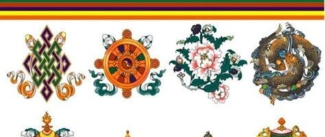 八瑞相(八吉祥徽或藏八宝):传统吉祥图。有吉祥结、妙莲、宝伞、右旋海螺、金轮、金幢、宝瓶、金鱼组成。象征吉祥、圆满、幸福等。