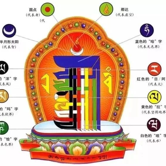 十相自在:藏语,朗久旺丹;汉译:十相自在。是时轮的精髓,是时轮金刚的核心表象意义,它是由七个梵文字母和三个图形联合组成。它标志密乘本尊及其坛场合为一体的一个时轮图形,组成十相自在的七个字母顺次标志着所依的无量宫房基的风、火、水、土四轮和须弥山及无量宫——两个梵文“哈”字。一个代表一切能依者的身、语、意和胸轮本尊,新月、圆点及竖笔形依次代表顶轮本尊的身、语、意。在莲花、日、月座上——由下至上。