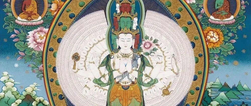 ན་མོ་རཏྣ་ཏྲ་ཡཱ་ཡ། ན་མཿཨཱརྱ་ཛྙཱ་ན་སཱ་ག་ར། བེེ་རོ་ཙ་ན། བྱུ་ཧ་རཱ་ཛཱ་ཡ། ཏ་ཐཱ་ག་ཏཱ་ཡ། ཨརྷ་ཏེ། སམྱཀྶཾ་བུདྡྷཡ། ན་མཿ སརྦ་ཏ་ཐཱ་ག་ཏ་བྷྱཿ ཨརྷ་ཏེ་བྷྱཿ སམྱཀྶཾ་བུདྡྷེ་བྷྱཿ ན་མཿ ཨཱརྱ་ཨ་ཝ་ལོ་ཀི་ཏེ་ཤྭ་རཱ་ཡ། བོ་དྷི་ས་ཏྭཱ་ཡ། མ་ཧཱ་ས་ཏྭཱ་ཡ། མ་ཧཱ་ཀཱ་རུ་ཎི་ཀཱ་ཡ། ཏདྱ་ཐཱ། ༀ་དྷ་ར་དྷ་ར། དྷི་རི་དྷི་རི། དྷུ་རུ་དྷུ་རུ། ཨིཊྚེ་ཝེཊྚེ། ཙ་ལེ་ཙ་ལེ། པྲ་ཙ་ལེ་པྲ་ཙ་ལེ། ཀུ་སུ་མེ་ཀུ་སུ་མེ་ཝ་རེ། ཨི་ལི་མི་ལི།ཙི་ཏི་ཛྭ་ལ་ཨ་པ་ན་ཡེ་སྭཱ་ཧཱ།南摩惹纳达拉雅雅 南摩阿里雅 佳纳 萨嘎拉 贝勒佳纳 尤哈拉 佳雅 达他嘎达雅 阿啦哈帝 桑雅桑布达雅 纳摩 萨噜哇 达他 嘎提呗 阿啦哈帝呗 桑雅桑布提喂 南摩 阿里雅 阿哇噜格帝 秀啦雅 布地萨唾雅 玛哈萨唾雅 玛哈嘎噜 尼噶雅 达地雅他 嗡 达啦 达啦 提力 提力 杜噜 杜噜 易笛威 易笛 加列 加列 不啦加列 不啦加列 固苏美 固苏玛 哇叠 易利 密利积地 作哈啦 玛巴 纳雅 梭哈祈竹仁波切:在观音大士生起菩提心的一刹那,他在阿弥陀佛面前发心立誓:“若我救度一切众生之心退转,我之头身当裂为千片!”在不断救度众生以后,大士见仍有无量众生在生死六道中受苦,故又继续以悲心救度。在一段时间后,他又再由净土中看下来,众生之数目仍然无量,他又再继续度生之事业。这样地重复数次、历经多劫以后,大士再一次观视,以为众生必已度尽了,但见六道中之众生仍然无量,似乎毫无减少之迹像。大士感到很灰心,显现出退心之情况,他的头及身体便马上应誓而裂成了千片。这时,他的上师阿弥陀佛马上现前,把他的身首碎片拾起,重合为千手十一面之相,更策励观音大士继续精进不懈。十一面观音咒约在公元五六一至五七七年间首先由耶舍崛多译出并开始流行,当时修行此咒且有成效的人很多,其发展约在公元六五六年间,由玄奘译出〈十一面神咒心经〉后达到顶峰,之后此咒在中土就渐渐没落了。现代汉地的佛教徒除非是对佛经与咒语有研究者,大概对十一面观音都相当陌生。而〈千手观音大悲咒〉比前者晚了约一百年传入中国,自公元650至660年间由迦梵达摩初译以来,此咒就一直广受中国人的欢喜与持诵,之后再继续汉译的同系咒语有十数种之多,在《大正藏》中居同系咒语汉译数量之冠。据经文所载,十一面观世音在无量劫以前,从“百莲华眼顶无障碍功德光明王如来”受持此咒,即证无生法忍。若有善男子善女人,至诚清净如法持诵,必可与观世音菩萨的慈悲愿力感应,且获得十种殊胜的利益:若能依教相应、如说修行,即能除灭重罪,所求如愿,并积聚无量功德,由此可见本咒之大威神力。