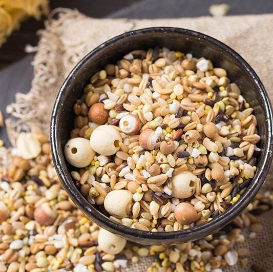 这种十谷粥其实非常简单,就是用糙米、黑糯米(紫糯米)、小米、小麦、荞麦、芡实、燕麦米、莲子、麦片和红薏仁(薏仁米)混合而成,各种材料份量大约相等,少三几种也没有关系。