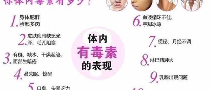 当毒素攻击神经系统,会使大脑皮层异常兴奋,出现失眠、早醒、多梦、烦躁、头胀痛;进而随大脑皮层功能的进一步减弱,出现嗜睡、周身无力、头脑昏沉等严重脑疲劳现象。当毒素攻击皮肤系统,会使皮肤黄锈、长色斑、干涩、粗糙、晦暗、无光等。