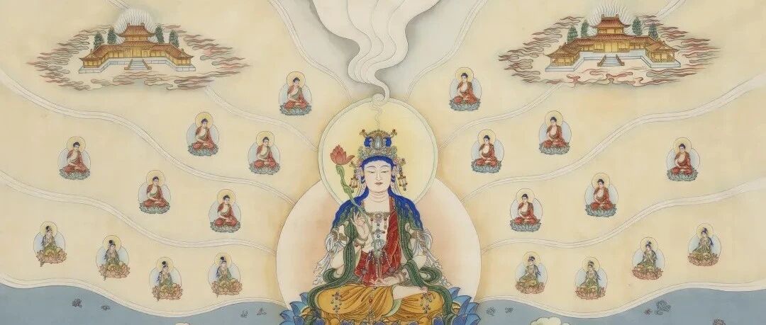 复说观自在菩萨最上秘密调伏仪:“行人当作[巾*((ㄇ@人)/登)]像,内画观自在菩萨,如闪电光轮,作金刚舞势,具足百臂圆如轮相,手持莲华等诸幖帜。于菩萨周匝画颦眉等贤圣,皆作忿怒相,亦持莲华并诸幖帜。如是依法画已,即成曼拏罗。然后于像前诵此一切法金刚三昧明曰: