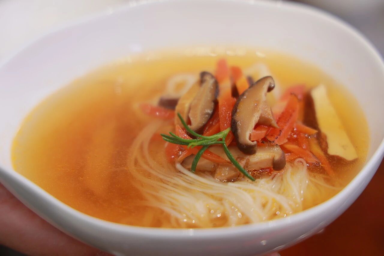 2. 锅中加水烧开,下细面,细面煮开即熟,把面捞出放在碗中,加入汤头,汤要宽。