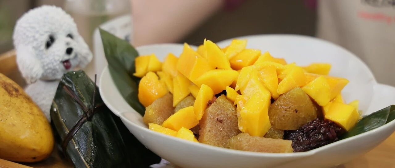 粽子切成小块,撒上芒果丁,最后浇上消炎茶,很美的味道,因为有消炎茶,也好消化。