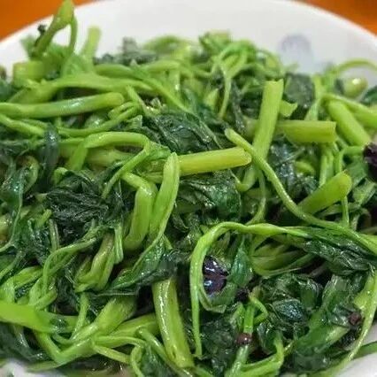 3、放入姜丝爆香后马上放入空心菜,大火素炒