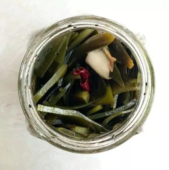 将海带切成条,按1:3的比例加食醋浸泡,冷藏10天,即可食用。