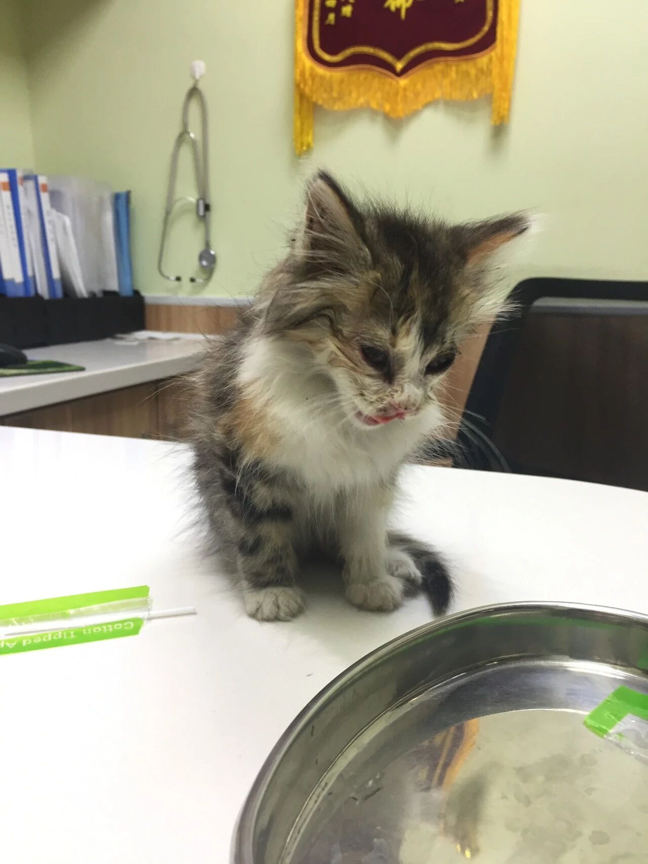 我们到了医院,医生看到小猫的时候,他还不确定是什么问题。检查完小猫的眼睛,发现小猫没得FPV这样的通病,正在遭受病毒性感染——微弱的喘息和偶尔的喷嚏。医生继续给我们更多关于小猫的详细状况。