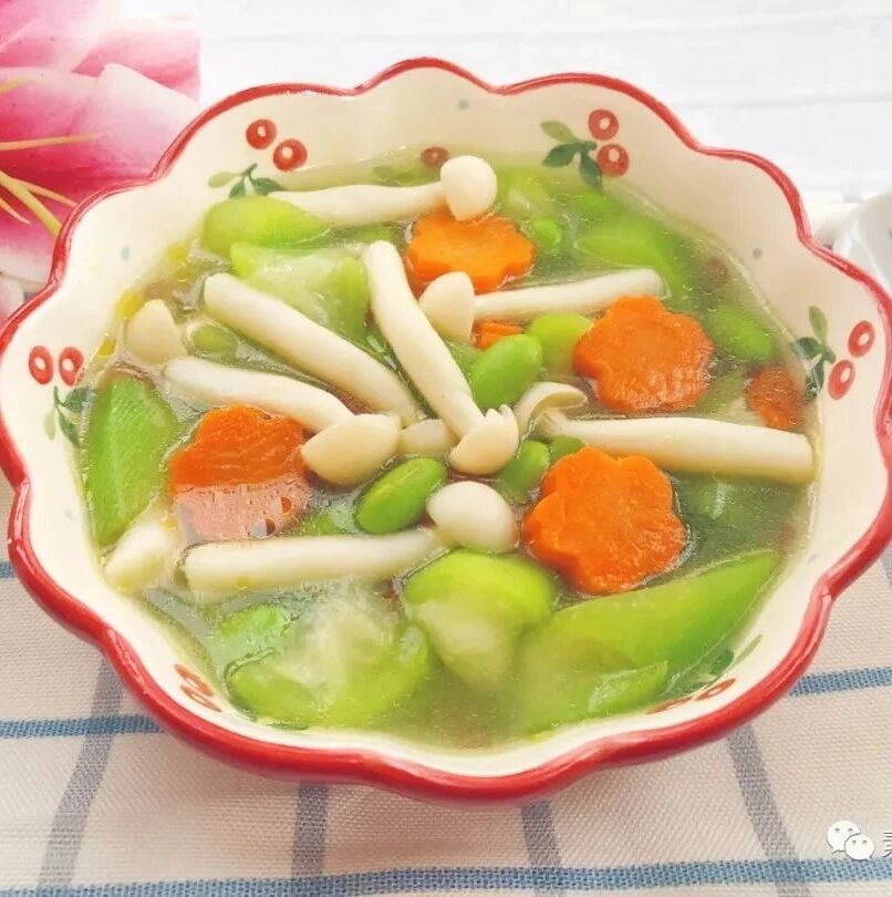 主料:丝瓜、毛豆、胡萝卜、白玉菇