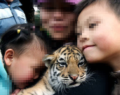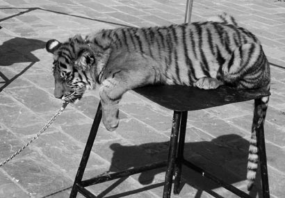 转眼之间,只有一个月大的小老虎就被摆到游乐广场的桌子上了。小老虎必须在烈日下任人摆布,任人拍照。它一天到晚饥肠辘辘。它还处在那样的婴幼期,需要时不时地吸吮妈妈的奶水,可是,它已经成了人们赚钱的小机器。它没有经常吸吮到妈妈的奶水的自由。虽然,它的奶妈现在是一条狗,可它情愿依偎在狗奶妈的怀里,也不愿意被人掐着、捏着搁在台子上饥渴无奈地被拍照。