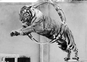 可是,他们就是要逼着老虎钻火圈。违背常识,变态地寻乐,这就是今天这个时代中国特有的景观,逼迫动物练习高难表演就是典型的例子。