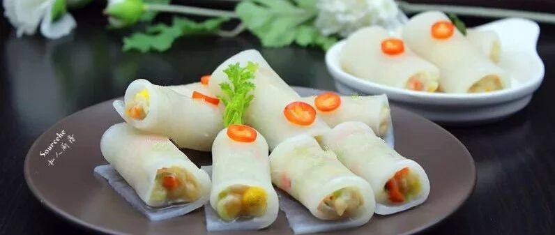2. 晶莹剔透的萝卜片放入调好的馅料,卷起来;