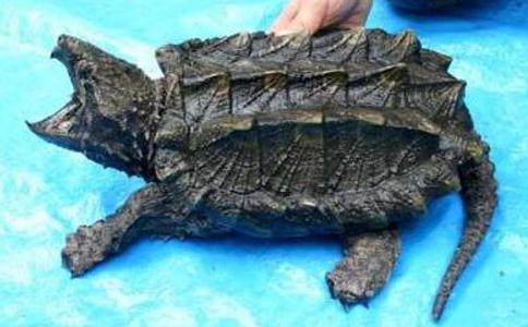 大鳄龟特征:真鳄龟长相酷似鳄鱼,集龟和鳄鱼于一体,故称真鳄龟。其头部较粗大,不能完全缩入壳内,脖子短而粗壮,领背长有褐色肉刺,眼细小,嘴巴上下颌较小,吻尖,尾巴尖而长,两边具棱,棱上长有肉突刺,尾背前边三分之二处有一条鳞皮状隆起棱背,并呈锯齿口状,背壳很薄,上皮以棕褐色为主,偶尔棕黄色,背部具有三条模糊棱,并有放射状斑纹,后缘呈齿状,腹部白色,偶有小黑斑点,幼时黑色,四肢粗壮,肌肉发达,爪子尖而有力,善于爬行。