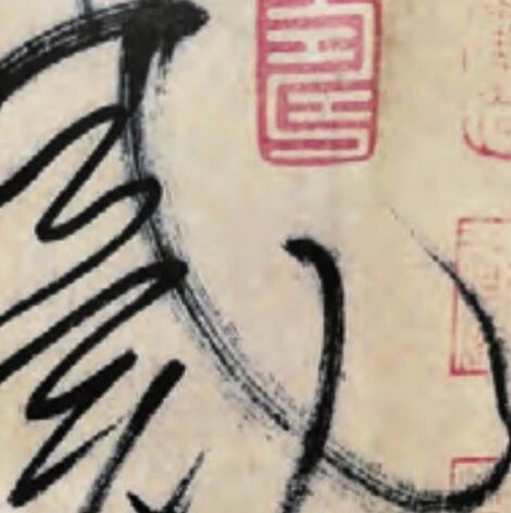 饱蘸浓墨而慢速书写时往往形成不了飞白,随着笔锥中墨量的减少以及运笔速度的增加,飞白逐渐显现。古人强调中锋运笔,推崇第一种类型的飞白线条,但是,草书运笔迅捷而不拘常理,笔锋变化不定,笔笔中锋已无可能,形成图2、图3中两种飞白形态实在自然不过。况且,三种飞白线条具有各自的审美价值,彼此间的组合更能丰富飞白的造型空间。飞白线条的组合而成的结体空间具有通透的视觉审美,类似于太湖石“瘦、皱、漏、透”的特点,如图4。单字中的飞白能突出单字的造型空间,连续出现而形成的飞白空间能制造整体造型空间的深度层次感。若能将飞白造型恰当运用于整篇,则能营造出“怒猊抉石,渴骥奔泉”之审美意境,例如徐渭的某些中堂立轴。近代林散之善于用墨,线条的飞白造型成为其草书笔墨语言的一大特色。线条的位置决定了单字结体内空白的造型,结体内空白越规则运动感越弱,造型越平稳。孙过庭云:“初学分布,但求平正;既知平正,务追险绝;既能险绝,复归平正。”“分布”即指单字结体空白的造型,空白从一定角度能影响字的平正与险绝。草书单字的结体内空白可总结为两类:1.封闭性的空白。指线条通过交叉、组合在纸面上形成的相对孤立、封闭的空白。这样的空白往往具有较为规整的图形,或圆形、或四边形、或三角形等等。当然当有了线条飞白的参与,封闭的空白具有了开放性的倾向。2.开放性的空白。指线条组合形成的空白不孤立,与字外空白或行间空白彼此连通。从形成的动机看,开放的单字空白又可分两类:(1)被动型开放空间。受制于汉字自身的结构特点,本身具有结构的开放性,书家无需有意改造字的造型,只要按字形特点书写即可成开放空间,如王铎;(2)主动型开放空间。书家将本是封闭的空间,通过线条的长短粗细的重组、结构的变形等等主动而有意识的创造,形成开放的空间,如祝允明、徐渭等。历代草书作品中飞白与结体内空白造型各有特色,现略举一二:张旭《古诗四帖》中的飞白造型不突出,调节整体造型空间层次的是笔墨形成的 “面”与“线”之间的对比,而不是飞白空间。结体内空白造型以开放性为主,封闭性空白造型尽量被压缩或者被夸张,或者将本是开放性的空白改造成较大的封闭空间,以此形成强烈对比,激活空间的造型,如图5“丹、 岩、列”三字。怀素《自叙帖》中的飞白造型与《古诗四帖》相仿,不是整体空间塑造的主要途径。结体内空白造型中封闭性的造型空白增多,呈现出较为规整的圆形、椭圆形或圆弧形,成为《自叙帖》空间造型的主要方法,如图6“激切”二字。黄庭坚草书中的飞白造型集中体现在《廉颇蔺相如列传》一帖,三种飞白形态一应俱全,大都集中于一处相互组合、对比,在建构独特的单字结体内空白造型的同时又形成造型的块面,并且出现多处,显示出调节章法空间的重要价值。《李白忆旧游诗》集中展现了黄庭坚结体内空白造型的特色。努力打破封闭性结体内空白造型的规整性,以取得与开放性空间的协调与统一,开放性空白的造型也体现出其主动的有意追求:一是多用互不连接的“点”;二是通过提按顿挫使线条呈现粗细断续,令封闭性空间出现开放性状态;三是有意缩小封闭性空间,甚至缩小到无空白,成为局部的笔墨块面。如图7“离、手持、过、君、 帝”等字。祝允明的结体内空白造型与黄庭坚类似,但更突出了开放性。“点”的大量运用以 及纯以点构成单字的造型,使其结体内空白与行间空白几无差别,如《前后赤壁赋》。《箜篌引》一帖中飞白造型较为集中,结体内空白几乎不见封闭性造型,是对唐宋以来草书形式的进一步革新与创造。对此,祝允明自己也颇为自得,在卷后自题道:“冬日烈风下写此,神在千百五年前,不知知者谁也。”徐渭的飞白在书写过程中增加了明显的提按与顿挫,使飞白中心的黑色墨线出现点状,运动感强烈。结体内空白造型也以开放性为主,封闭性空白形状不同于祝允明、黄庭坚而接近于怀素,显得较为规则,长卷作品最为典型。王铎狂草长卷都有大量线条飞白的造型,第三类飞白运用尤其广泛,成为王铎重要的形式语言之一。结体内造型不做纵向或横向的夸张变形,显得较为中性,上下之间多以牵丝线条连接,故单字结体内的空白多为封闭性空间,与祝允明形成结体空白造型的两极。
