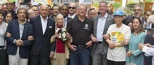 为了唤起各阶层的广泛关注,联合国前秘书长潘基文(右一)、纽约市长白思豪(右二)、法国外长法比尤斯(左一)、美国前副总统戈尔(右三)、著名生物学家珍妮·古道尔(左二)等众多国际名流也参与到游行的队伍中。