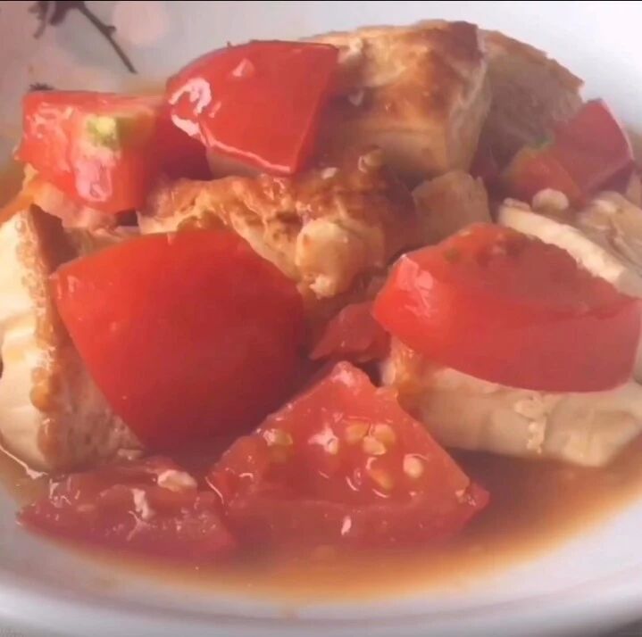 4、番茄煮软后倒入煎豆腐,加入盐、素耗油翻炒片刻出锅。