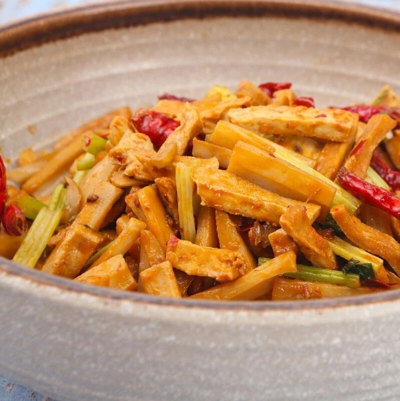 热锅起油,放入素鸡煎炒香,盛出备用