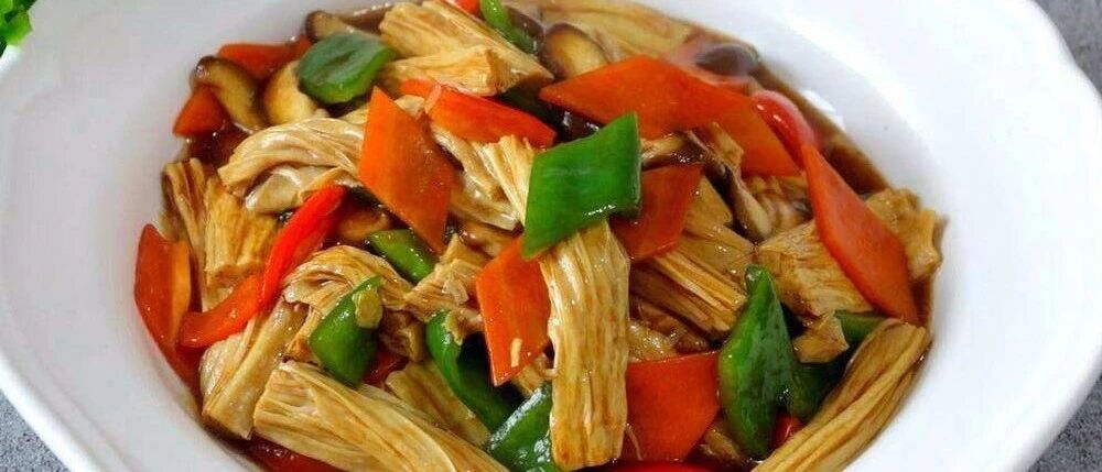 6. 依次下香菇胡萝卜和腐竹翻炒。