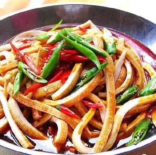 青、紅辣椒斜切,用麻油先稍微爆香,然后关火,再把百頁絲倒入,取自己適合的麻辣油加入,用铲子拌勻盛盘,即是一道勁爆的麻辣百頁丝。