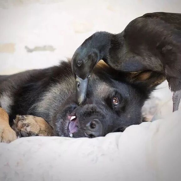 野鸭刚来到这个家时,Natacha根本不担心它会和亲切友好的狗狗相处不好,所以没有任何顾虑的把它们放在了一起。