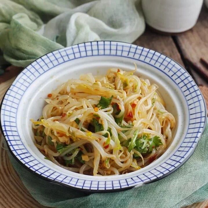 5. 豆芽和芹菜叶捞出攥水,放入小盆里,加入橄榄油